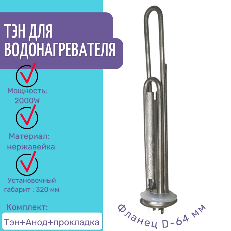 ТЭН PREMIUM для водонагревателя 2500W, фланец 92мм, комплет, RF, Electrolux, Etalon, Garanterm нержавейка, Thermowatt
